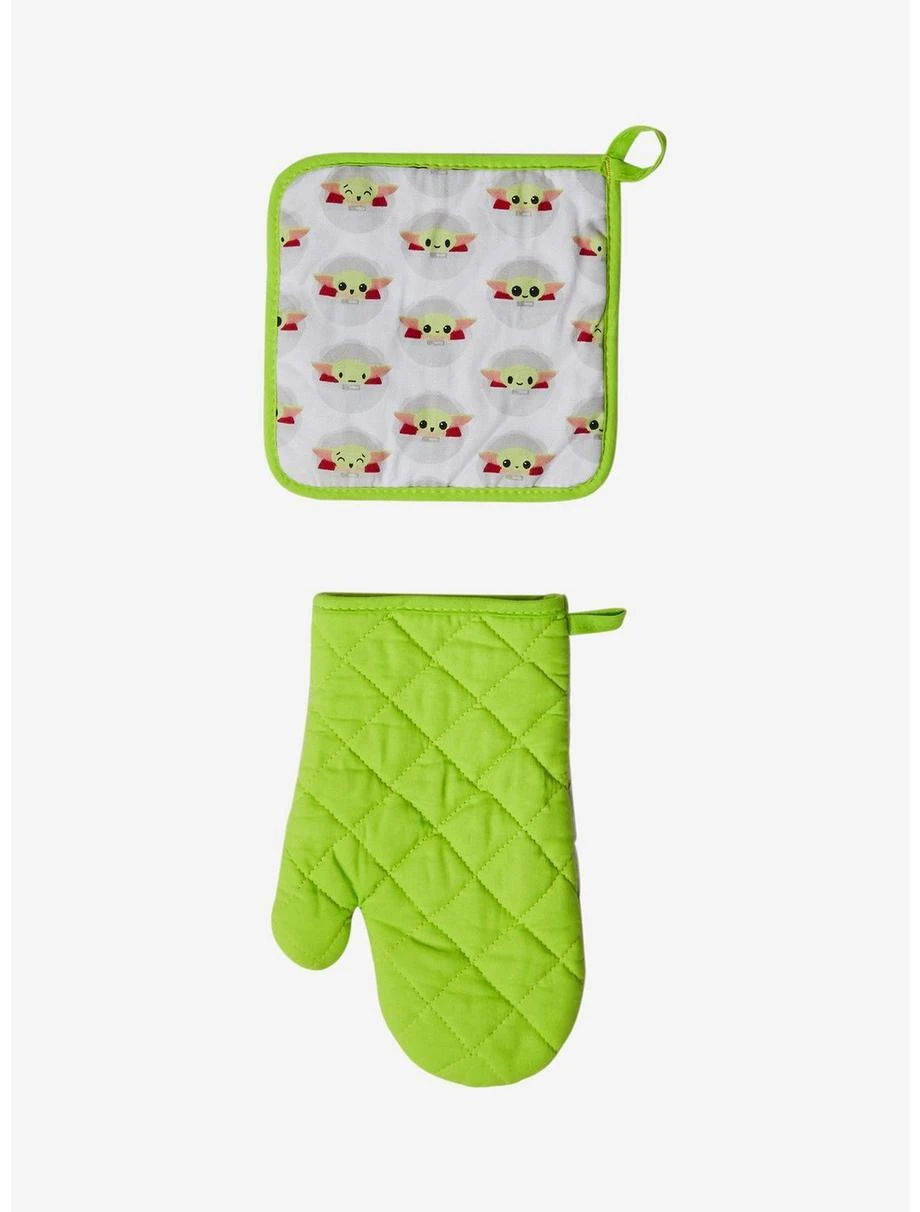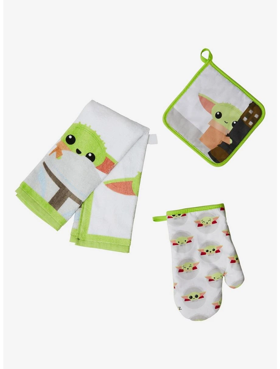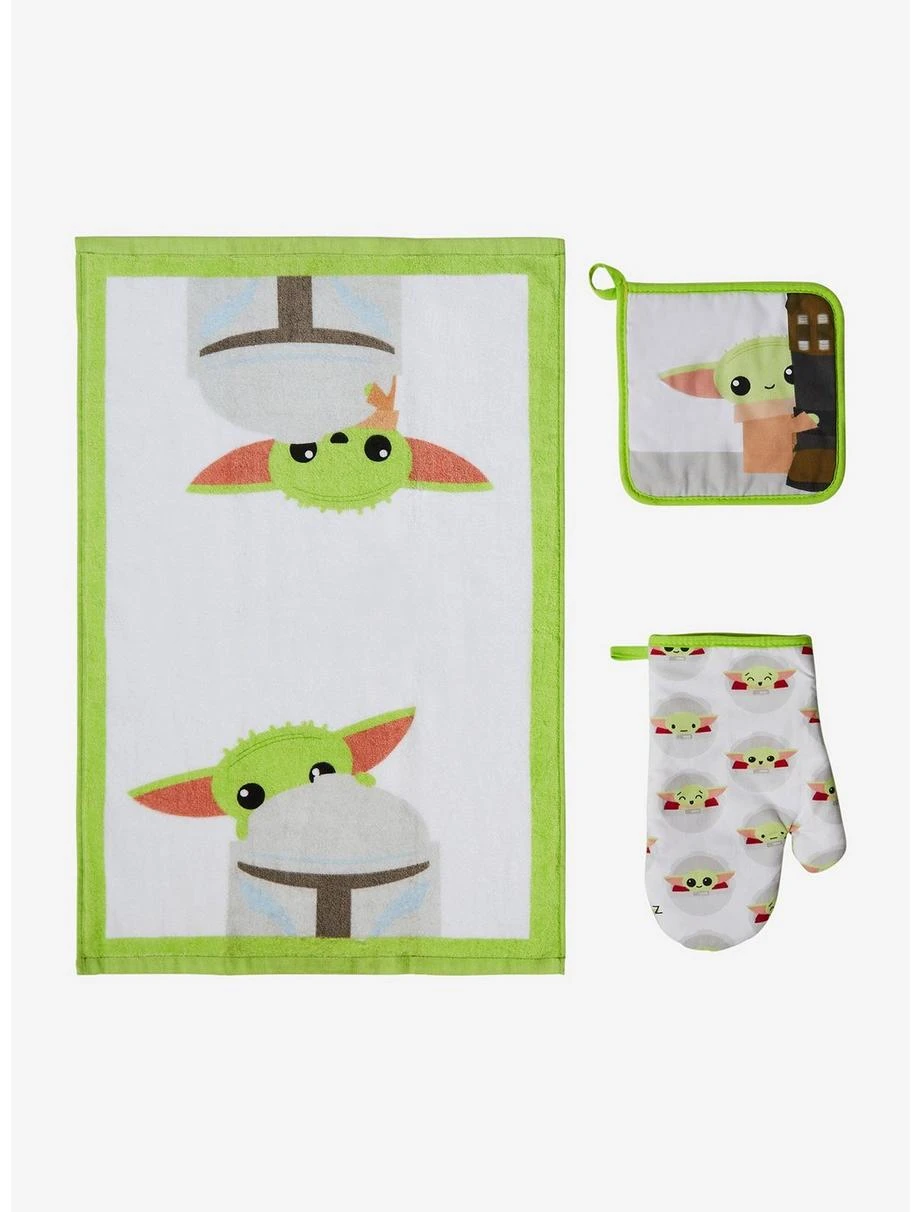 - Pot holder approx. 7 1/2″ W x 7 1/2″ H; oven mitt approx. 6 1/4″ W x 10 1/2″ H; dish towel approx. 16″ W x 24″ H